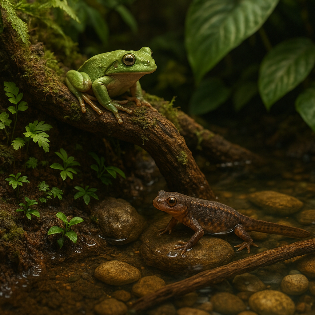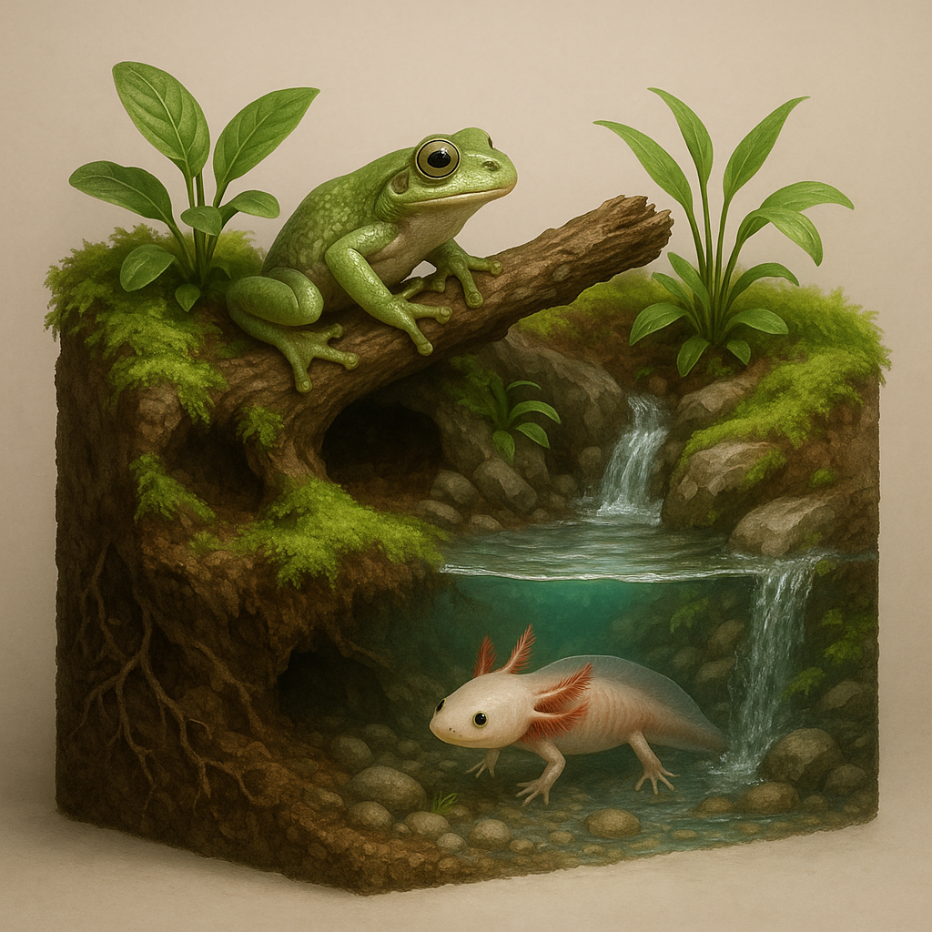 Les paludariums conviennent parfaitement aux grenouilles tropicales, tritons, axolotls et à certaines tortues semi-aquatiques. Il suffit d’adapter les paramètres comme la température, l’humidité et les aménagements selon l’espèce.