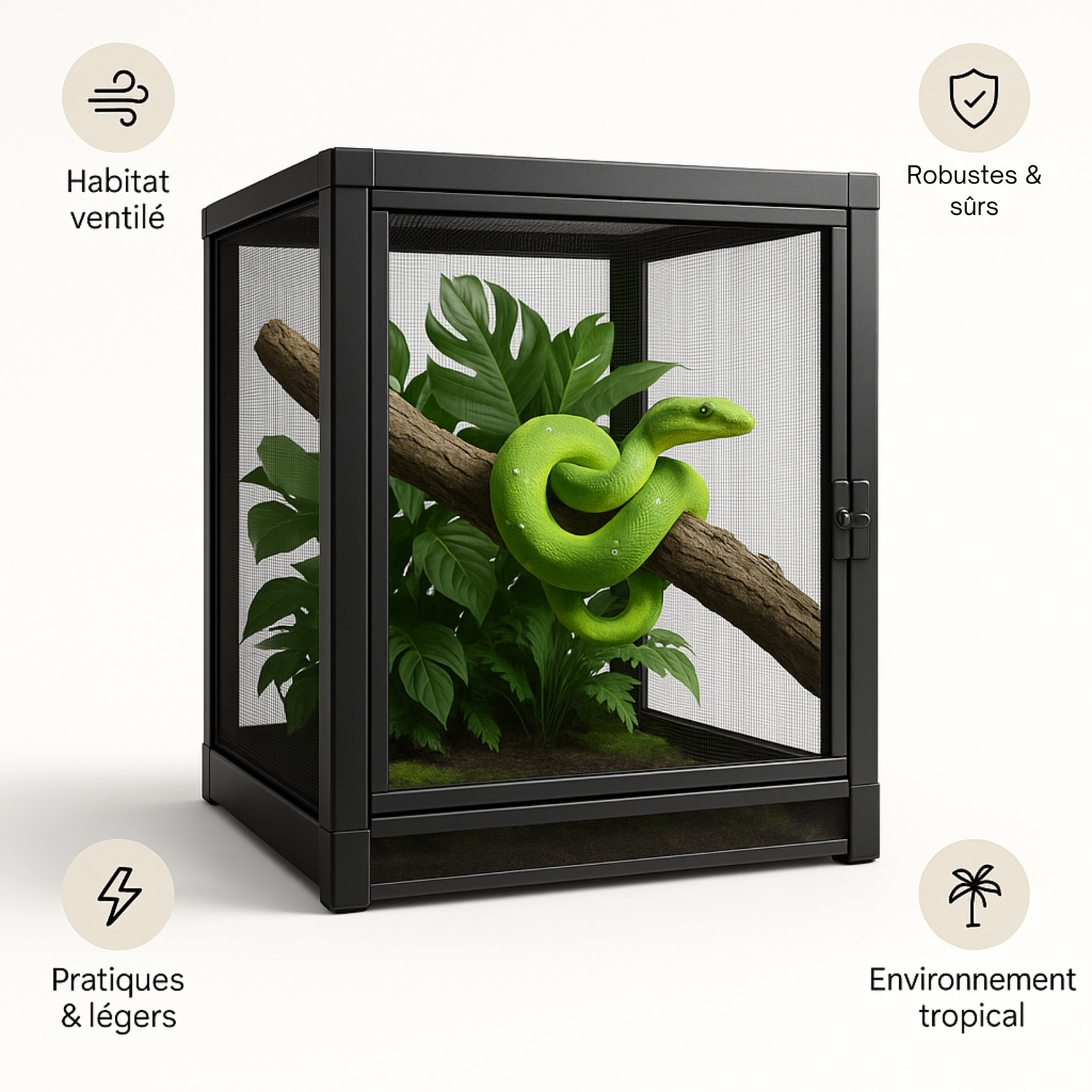 Légers, robustes et parfaitement ventilés, ces terrariums recréent un environnement tropical idéal pour le bien-être de vos reptiles.
